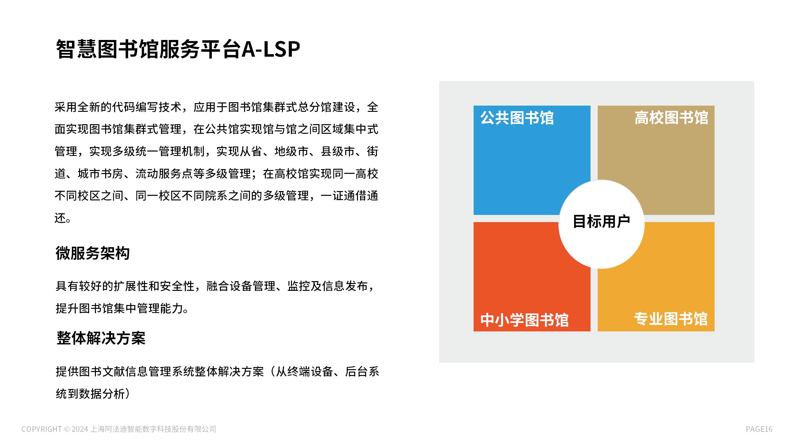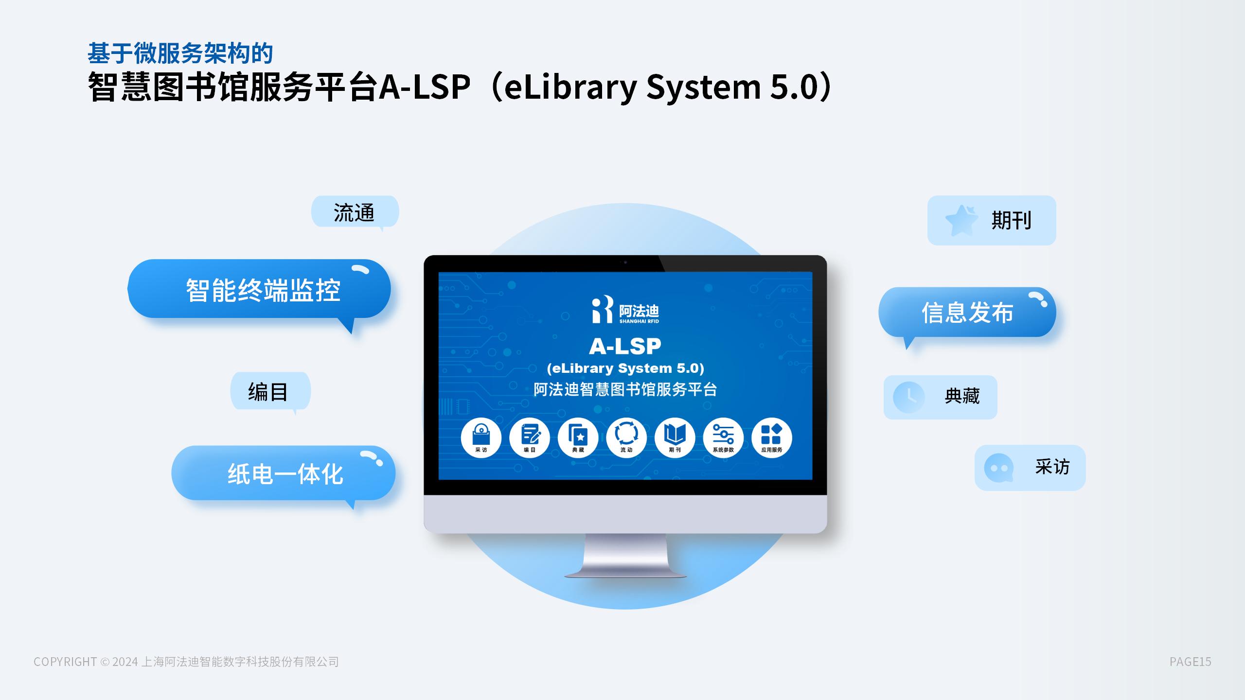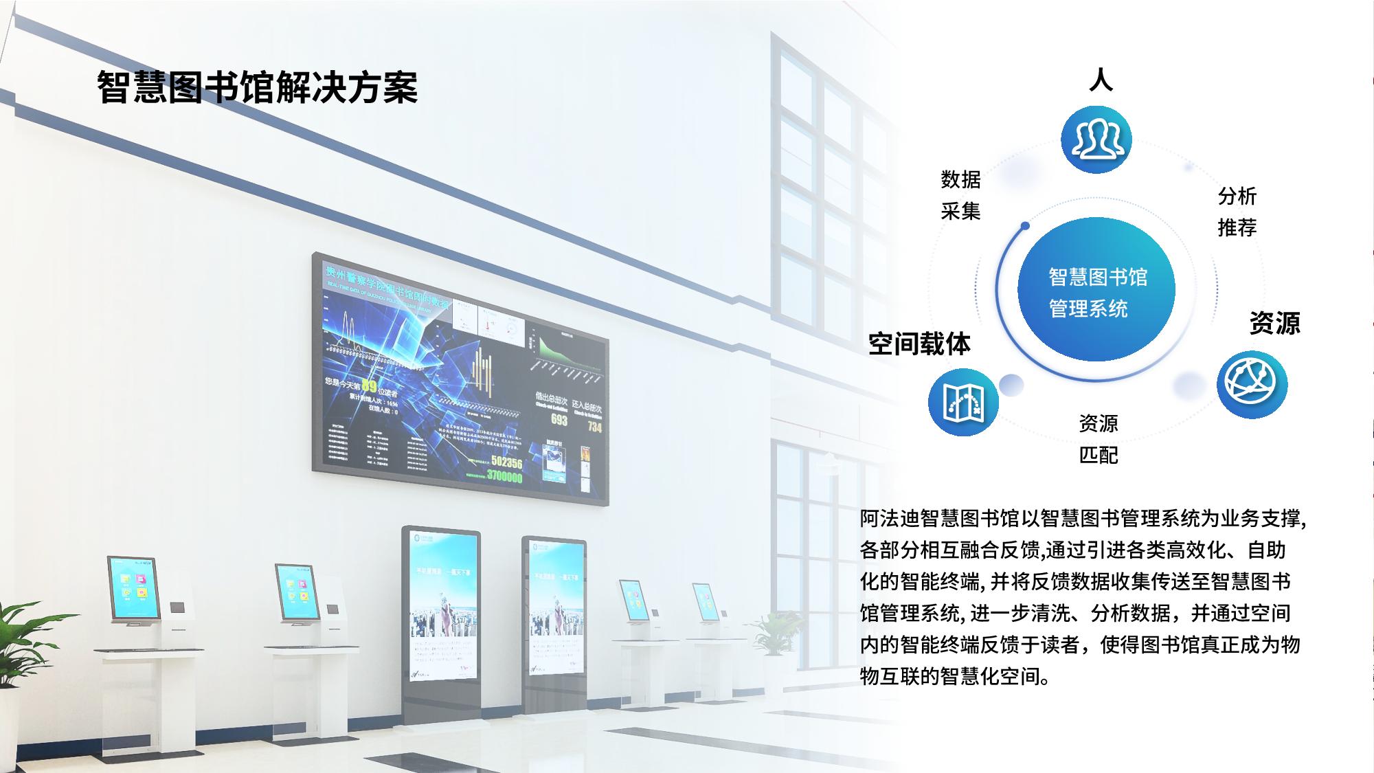 阿法迪智慧图书馆以智慧图书管理系统为业务支撑,各部分相互融合反馈,通过引进各类高效化、自助化的智能终端,并将反馈数据收集传送至智慧图书馆管理系统,进一步清洗、分析数据,并通过空间内的智能终端反馈于读者,使得图书馆真正成为物物互联的智慧化空间。